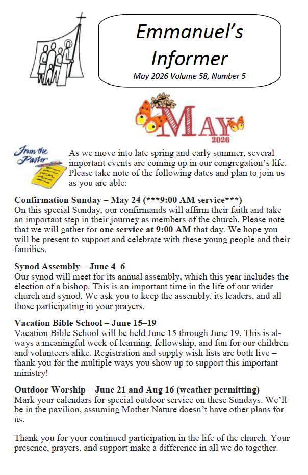 Late spring and early summer is always a jam packed time of year, and this year is no exception! From confirmation for several young people on Sunday May 24 at a special time of 9:00am, to the Sons of the Civil War offering their annual moving Memorial Day ceremony immediately following, to Synod Assembly, to Vacation Bible School coming 6/15-19 – it’s going to be a fun May and June! Outdoor Sunday worship has been scheduled for this summer as well. Join us at 9:30am on June 21 and August 16, both weather permitting.